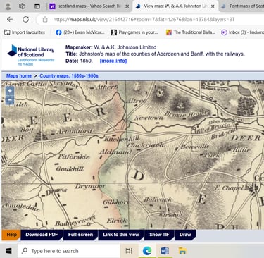 ‘There were formerly within the parish several interesting Druidical remains. There are two woollen mills at Millbrake and Aden. There are also in the parish eight mill meals. A number of the parishioners are linen weavers.’ The 1861 Imperial Gazetteer Of Scotland