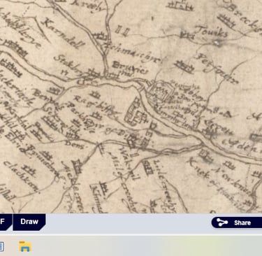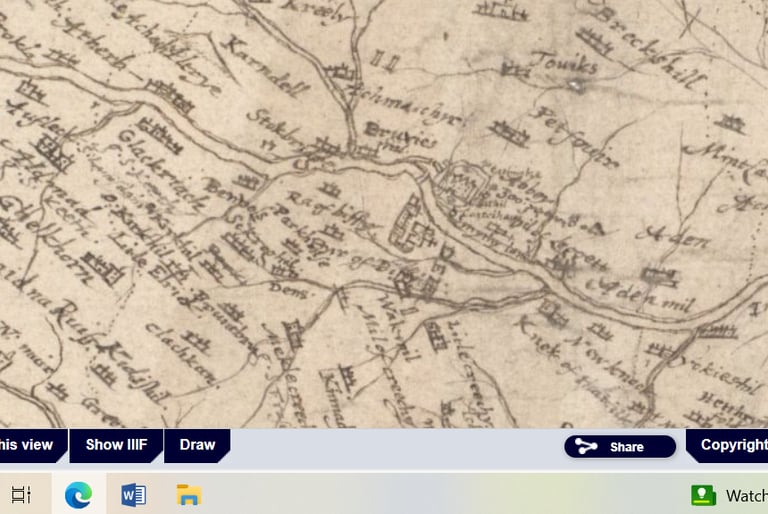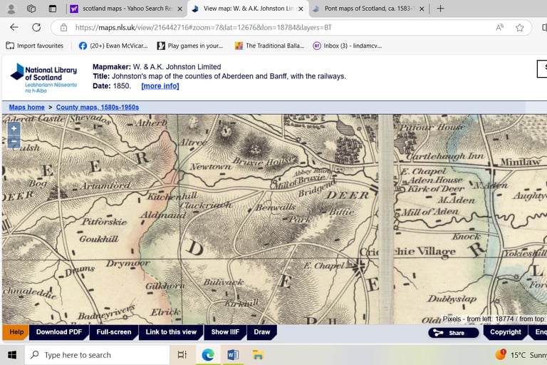 The 1861 Imperial Gazetteer Of Scotland lists Biffy as one of the four villages of Old Deer, and the Pont map of about 1610 has the words ‘Ra Biffy’ and ‘Byr Of Biffy’ at a spot south of Bruxie and west of Mill Of Aden. Johnston’s 1850 map shows only one building there, labelled Biffie. Some maps show the 'Brae Of Biffie'.